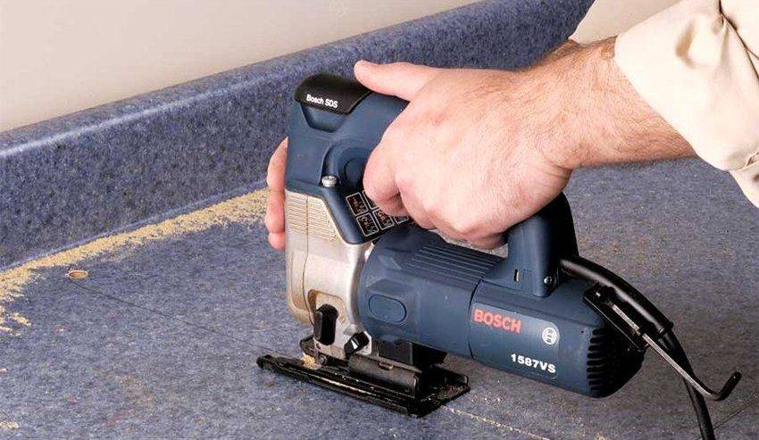 Выпиливая отверстие под раковину в столешнице, не нужно сильно нажимать на инструмент, иначе можно повредить декоративное покрытие основания. Лучше делать все медленно и аккуратно