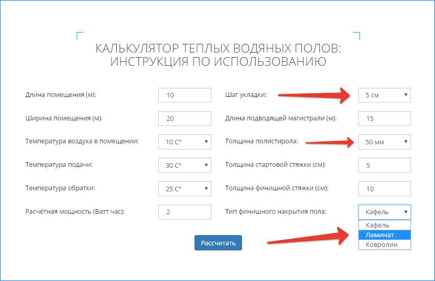 Задайте остальные данные, не забудьте про тип напольного покрытия. Если вы хотите использовать, к примеру, деревянный паркет, то мощность системы должна быть больше, поскольку дерево обладает не высокой теплопроводностью. Лучше отдать предпочтение в пользу кафеля или ламината.