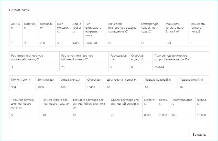 Планирование водяного теплого пола – расчет отопительных контуров и объема труб по программе