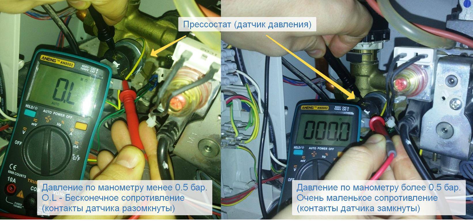 Плата управления газового котла осуществляет контроль давления специальным датчиком — прессостатом. Он не измеряет величину давления, а настроен на определенную величину (для котлов baxi 0.45 бар). На датчике два контакта и соответственно два положения. Если давление воды в котле меньше 0.45 бар — контакты разомкнуты, если больше — замкнуты. Поэтому проверка исправности датчика сводится к измерению сопротивления на контактах. Для этого необходимо отключить питание котла, снять провода с датчика и прибором (мультиметром) проверить сопротивление («прозвонить»). Если показания будут не соответствовать описанной логике, вероятно, что датчик необходимо заменить.