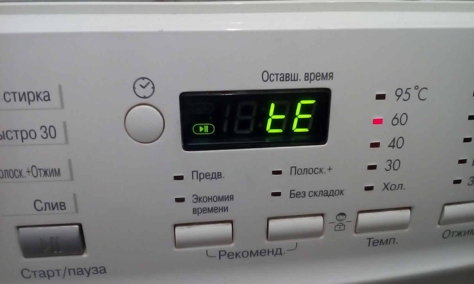 - ТЕ – код ошибки, указывающий на проблемы с датчиками. Проявляет неисправность в отсутствие нагрева воды до требуемой температуры (установленной программой). Если вода остается холодной, то главная причина – поломка нагревательного элемента.