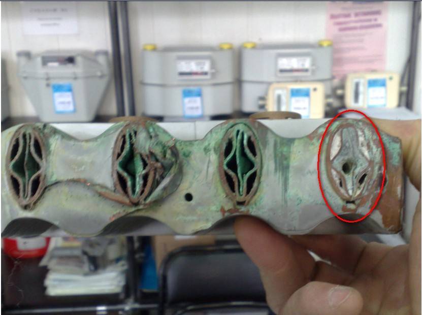 На все виды обменников воздействуют неблагоприятные факторы. Ухудшается качество металла, уменьшается проходимость каналов, напор воды бьет по стенкам. На первичный и битермический воздействует пламя главной горелки.