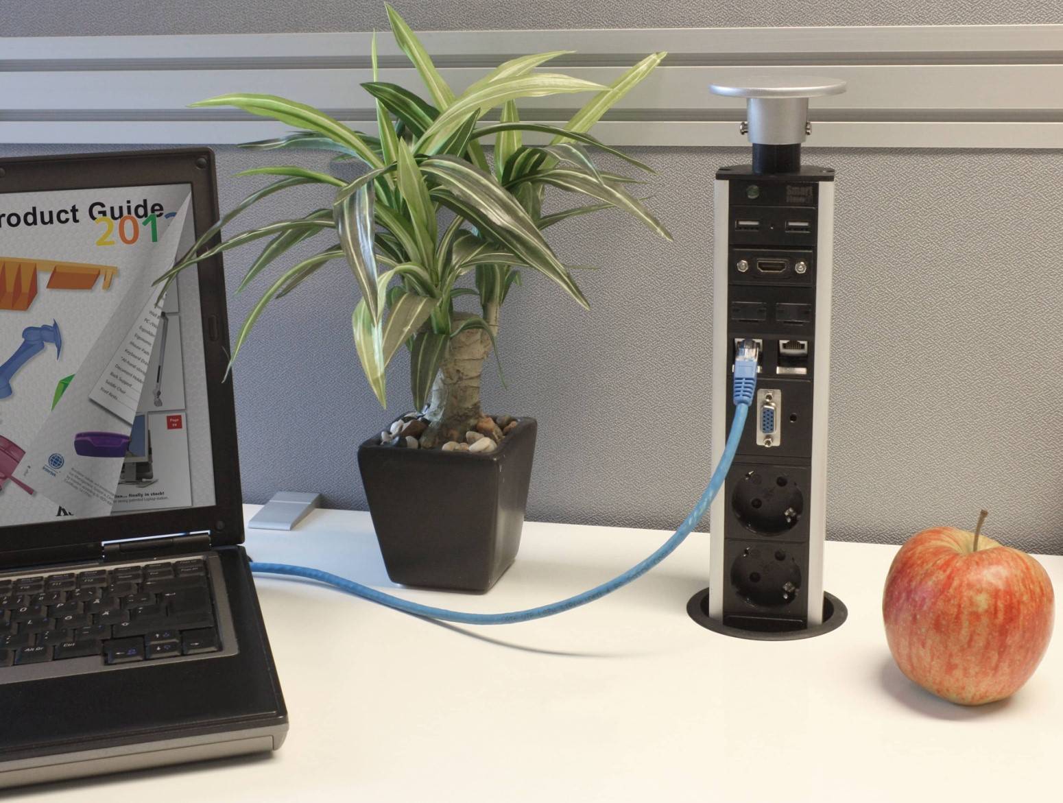 - выдвижные розетки – это более продвинутый вариант, который является достойной альтернативой удлинителям, и позволяют одновременно подключить несколько электроприборов. Обычно их скрывают в столешнице или в шкафчике, чтобы защитить от воздействия пыли и влаги;