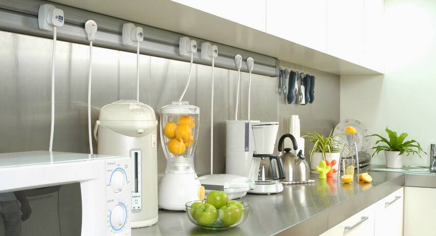 Рассчитать необходимое для кухни количество розеток несложно. Все, что нужно сделать – подумать, какими электроприборами вы будете пользоваться и сделать запас, примерно 20-25%. В основном, список обязательных электроприборов, которым нужно питание от розетки, выглядит следующим образом: