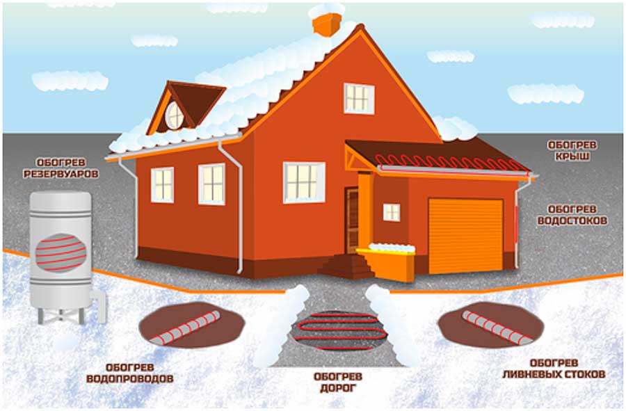 Одна из главных особенностей саморегулирующего кабеля — обширная сфера применения. Он подходит для нагрева карнизов, водопроводов, кровли и водостоков, пола и других участков, где нельзя допустить замерзания воды.