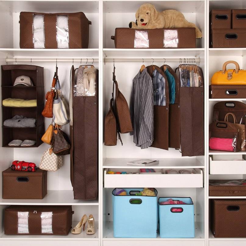 В органайзер также можно уложить постельные принадлежности и полотенца. Текстиль раскладывают по отсекам в соответствии с размером, цветом, составом ткани, частотой использования. Есть навесные органайзеры с карманами, в которые можно поместить обувь вместо громоздких коробок. Такие приспособления, а также текстильные чехлы хорошо использовать для сезонного хранения одежды, сумок, сапог, ботинок.