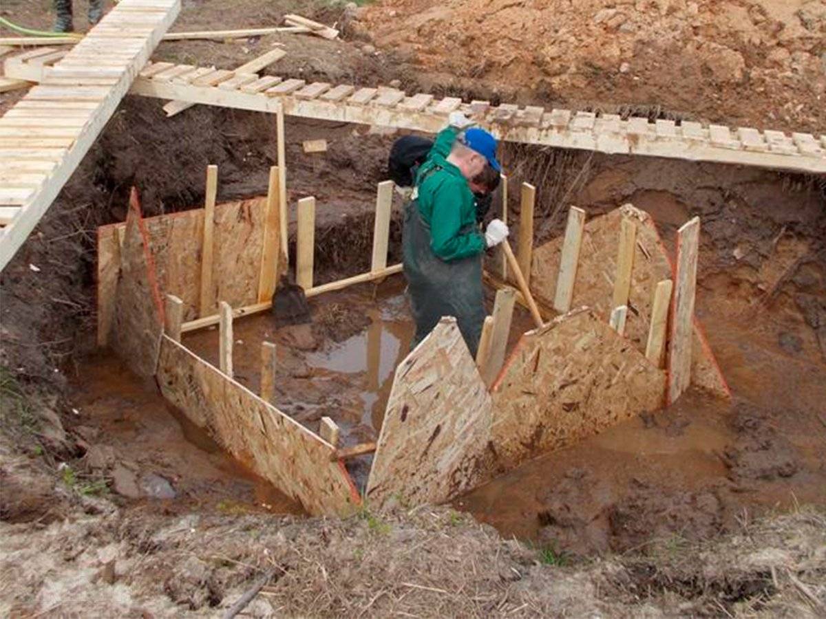 - стены ямы укрепляются досками, чтобы не допустить обвала грунта;