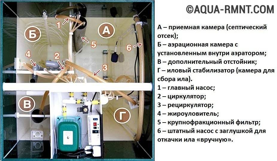 - камеры глубокой аэробной очистки объемом 750 литров, где производится переработка органических включений активной микрофлорой;