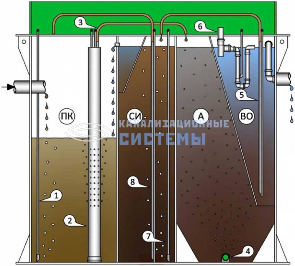 - По входной трубе (1) стоки поступают в приемную камеру (А). В нижней части отсека установлен аэратор (6), насыщающий активный ил пузырьками воздуха. На этом участке происходит первый этап очистки, причем в работу уже на этой стадии вступают микроорганизмы. Они расщепляют органические соединения, измельчая таким образом крупные частицы стоков. Далее, жидкость через фильтр грубой очистки (7) с помощью эрлифта (8) перекачивается на следующий участок (в камеру Б).