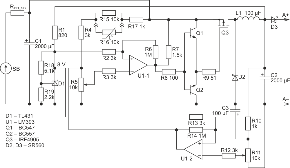 - Питание компаратора и источника опорного напряжения производится с выхода устройства, что гарантирует автоматическое отключение контроллера при отключении аккумулятора.