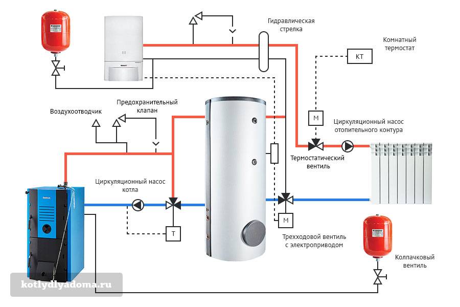 В этом случае работая на нагрев первичного контура в баке-аккумуляторее, регулировка режима отопления будет осуществляется во вторичном контуре отопления от бака-аккумулятора через трехходовой кран путем подмеса холодной воды от обратного теплоносителя с горячей от подающей линии.
