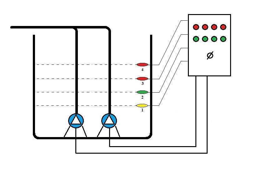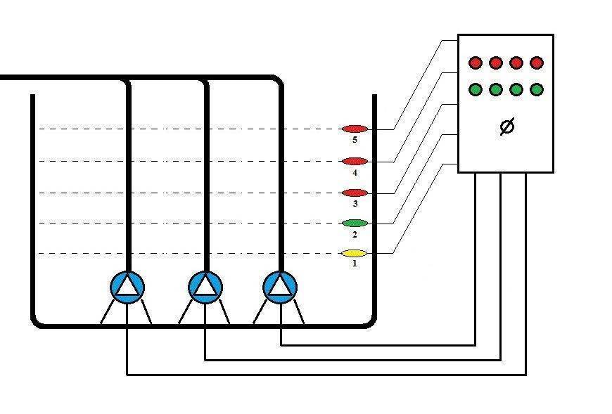В автоматическом режиме сигналы на запуск и остановку поступают от внешних устройств контроля уровня (см. схему).