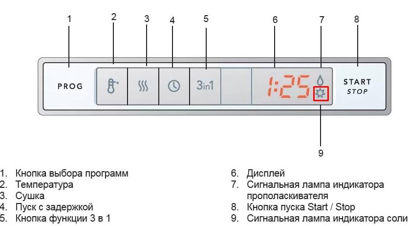 Когда не хватает соли в ионообменнике, то на панели посудомойки загорается индикатор. Надо добавить соль в резервуар, возникает вопрос сколько? Можно сразу насыпать больше, но так, чтобы отсек не был слишком полным. На сколько соли хватает, зависит от качества воды, чем она жестче, тем выше расход. Используя таблетки с содержанием соли, вопрос, сколько соли сыпать, не возникнет, в ней соли столько, сколько растворится за один цикл мойки. Для маленькой посудомоечной машины такую таблетку можно разделить пополам, но не толочь в порошок.