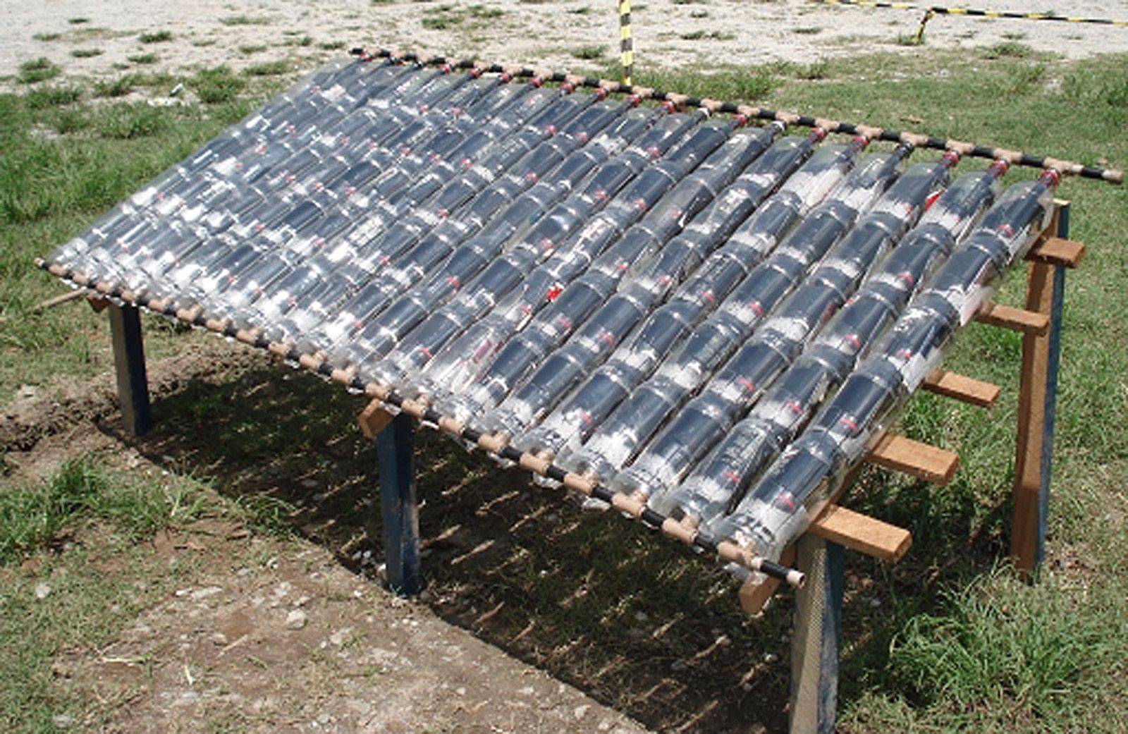Самодельный солнечный коллектор можно изготовить своими руками практически из мусора, затраты только пойдут на покупку ПВХ труб, тройников, кранов и герметика, остальные материалы — пластиковые бутылки, тетрапакеты и прочий материал, можно просто накопить, не выбрасывая ёмкости от выпитых соков, минеральной воды, молока и пр.