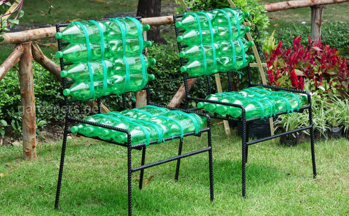 Если у вас есть возможность сварить каркас садового кресла из металла — отлично. Делайте его, а после при помощи веревки и бутылок, одинаковых по размеру и цвету, обвязывайте пластиком, формируя таким образом спинку и сидушку.