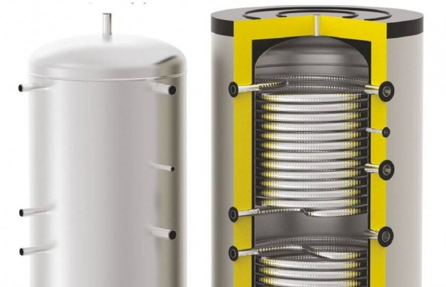 Теплоаккумуляторы для отопления могут быть с термоизоляцией и без нее. Также в зависимости от того, какая модель и схема отопления с теплоаккумулятором, в баке может быть один или несколько встроенных змеевиков-теплообменников, сделанных из черной стали. Схема отопления с тепловым аккумулятором может быть и с встроенным резервуаром для воды (внутренний бойлер) для снабжения горячей водой.