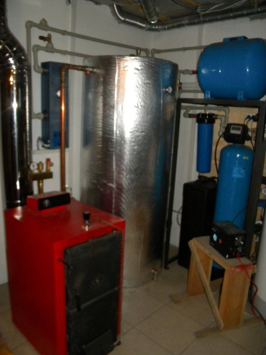 - Бак с водой — гарант того, что в системе не перегреется вода (при правильном расчете длины теплообменника и емкости резервуара).