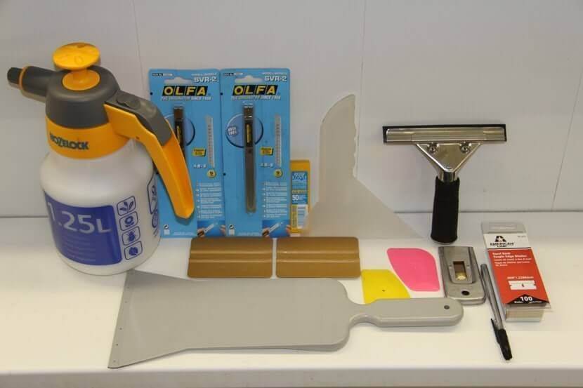 Чтобы свести к минимуму количество времени, необходимого для выполнения работ по тонировке стекла, следует корректно подобрать нужные инструменты. Приблизительный список оборудования будет выглядеть следующим образом: