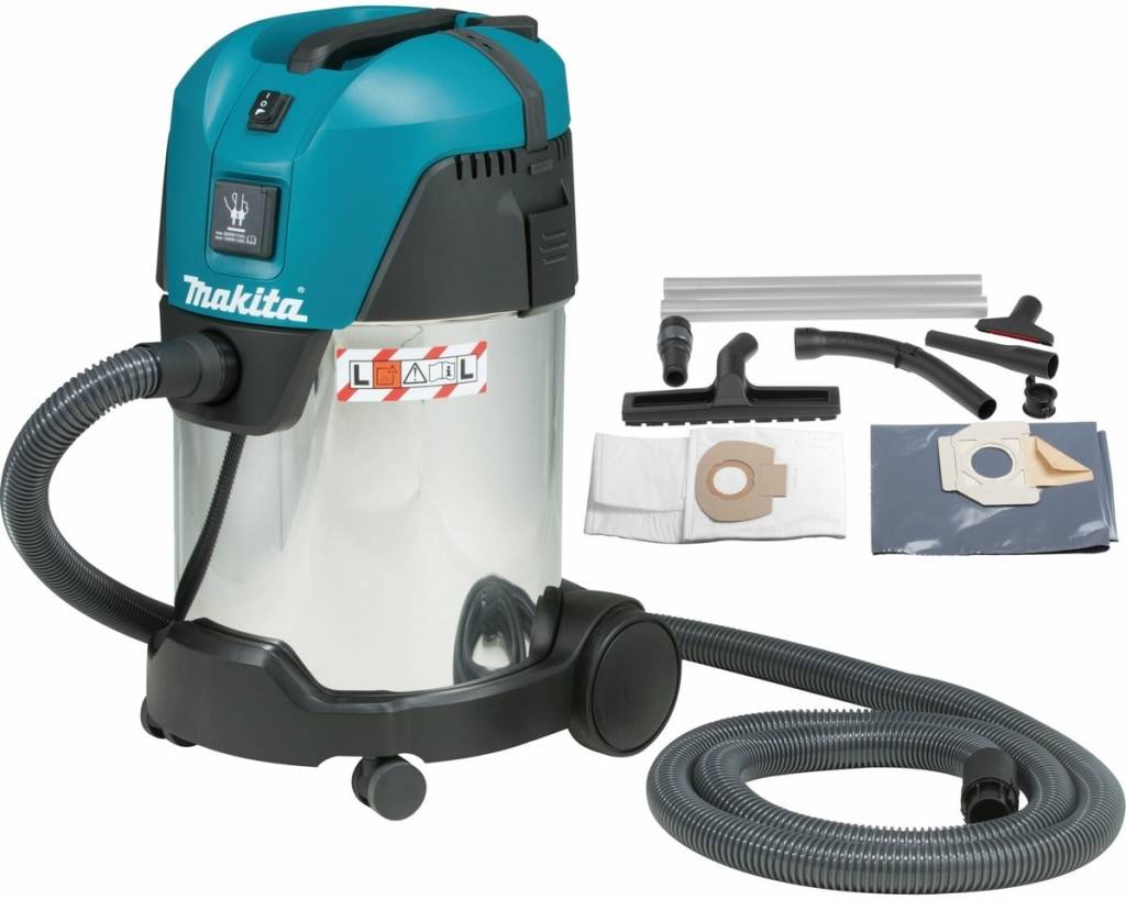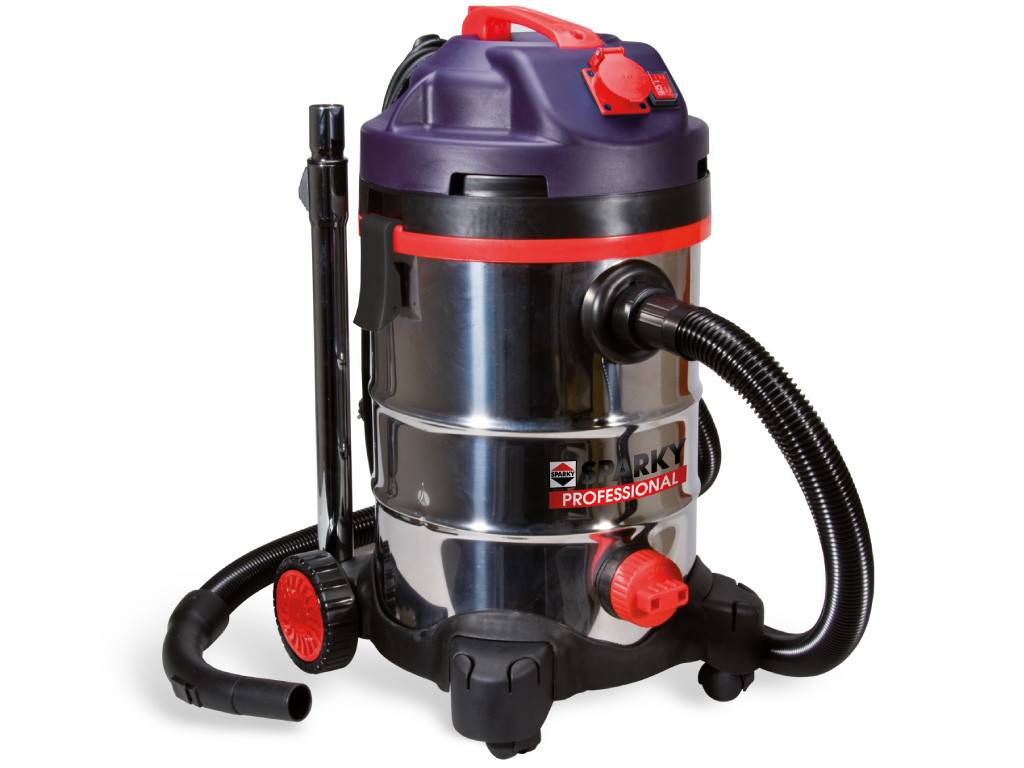 Стильно оформленный пылесос на четырех колесах предполагает возможность подключения дополнительного электроинструмента. Он прекрасно справляется со строительной и обычной пылью, но чаще используется именно при ремонте и строительстве, поскольку оснащен вместительным баком для мусора.