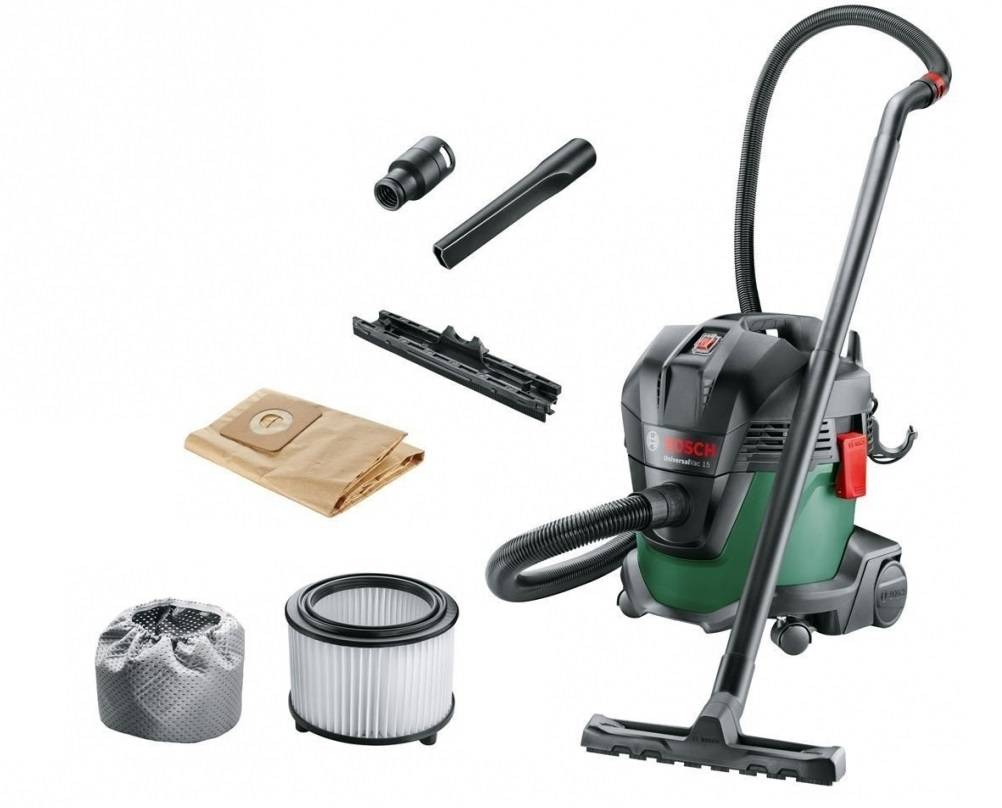 Укомплектован тремя фильтрами: одноразовый из бумаги (для домашней уборки), поролон на мотор (для воды) и мешок (для строительных элементов). Хорош в дуэте с перфоратором.