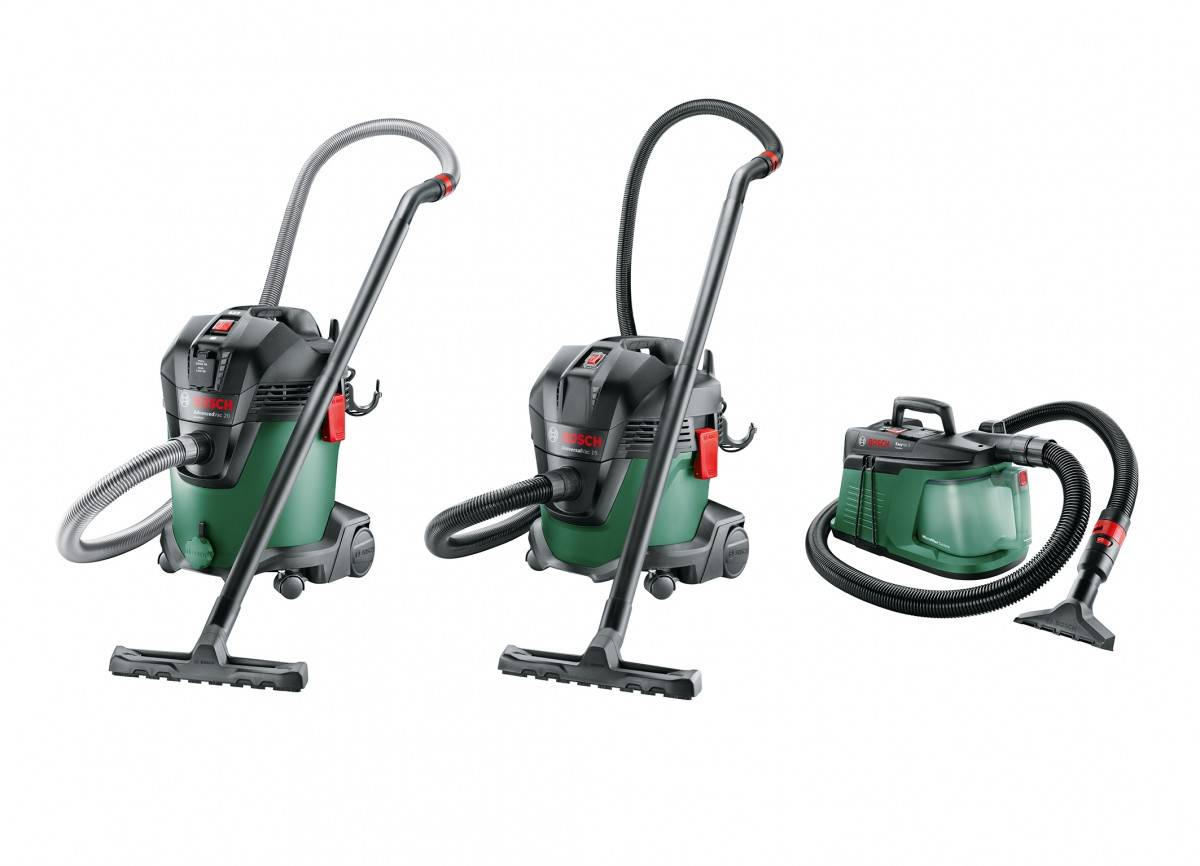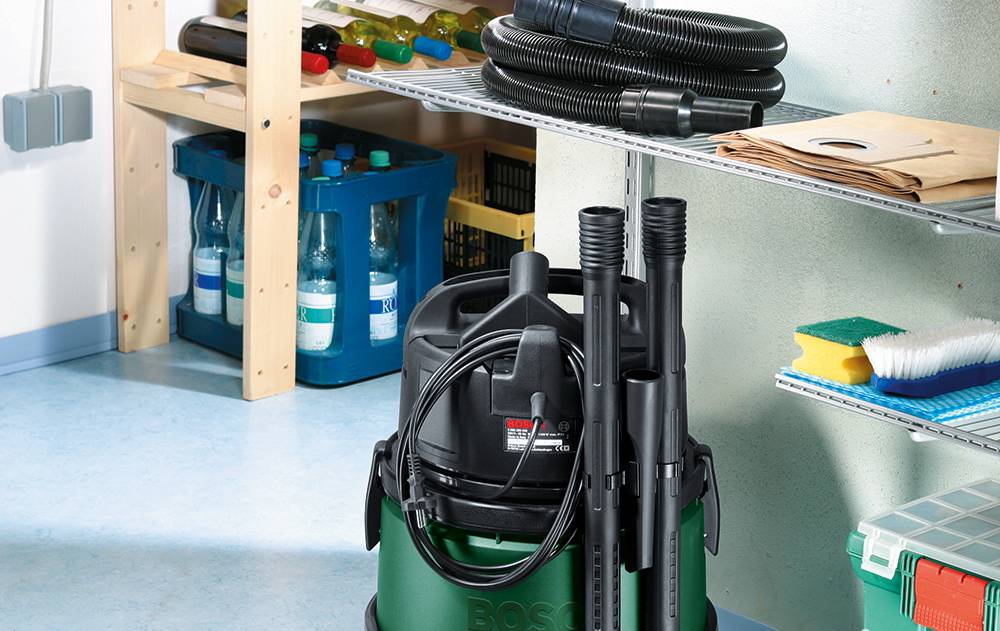 Еще одна модель от фирмы Бош с универсальным адаптером для подключения других инструментов компании. Контейнер, вмещающий в себя 20 литров отходов, выполнен из ударопрочной нержавейки. Для хранения всех кабелей и аксессуаров прямо в пылесосе имеются специальные отсеки, есть дренажный клапан для опорожнения большого количества жидкости за раз.