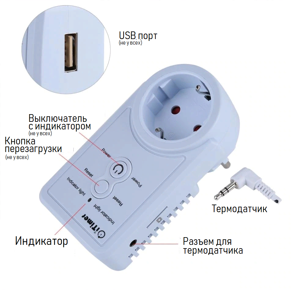 Термостат – регулирует температуру в помещении путем автоматического включения / выключения обогревателя или другой климатической техники, подключенной к розетке в случае достижения заданной температуры.