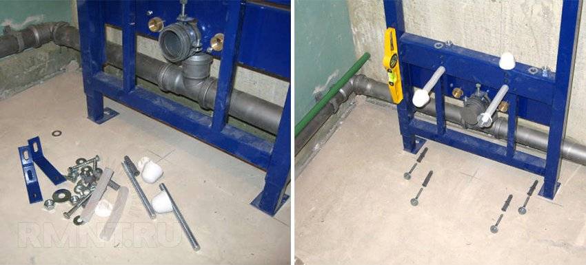 Собранную готовую инсталляцию крепят к стене и к полу. Для этого предварительно осуществляют разметку и проделывают отверстия в соответствующих местах. После чего раму прикладывают к разметке и фиксируют ее соответствующими инструментами в правильном положении.