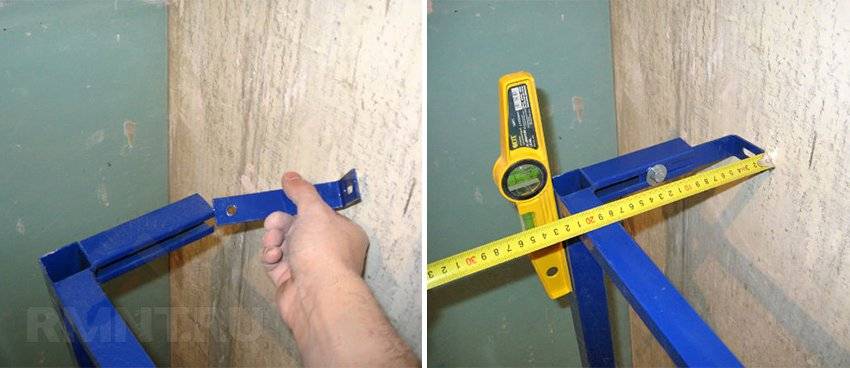 - проверяется перпендикулярность нарисованной линии по отношению к смежной стене. Если нет 90o, точки расположения ног корректируются. При этом у ног рамы станет разное расстояние до стены. Здесь нужно сохранить у ближайшей к стене ноги реальную глубину конструкции с добавлением 1,5 см.
