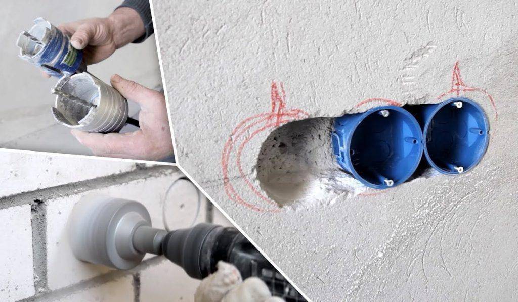 Она погружается в бетонную стенку на всю глубину корпуса. Насадкой-лопаткой выбивается цилиндр высверленного бетона. Дно отверстия выравнивается. Проводится примерка подрозетника. Так можно сделать необходимое количество отверстий.