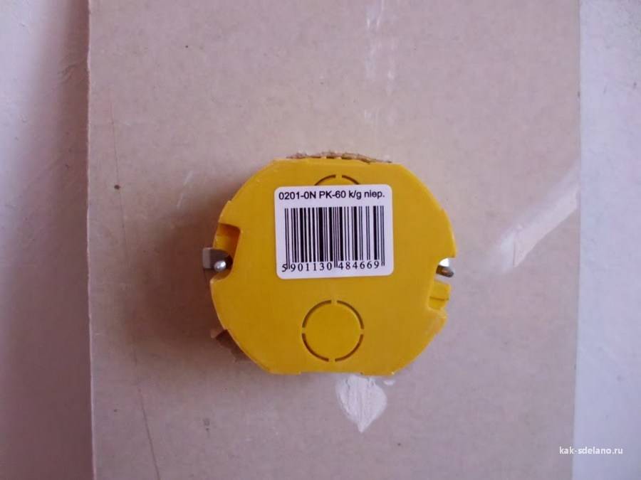 Изготавливается из огнеупорного полипропилена, что очень важно в процессе установки силовых электрических деталей сети 220 В. Прибор оснащается двумя саморезами, чтобы закрепить его в стенах из гипсокартона используя «ушки».
