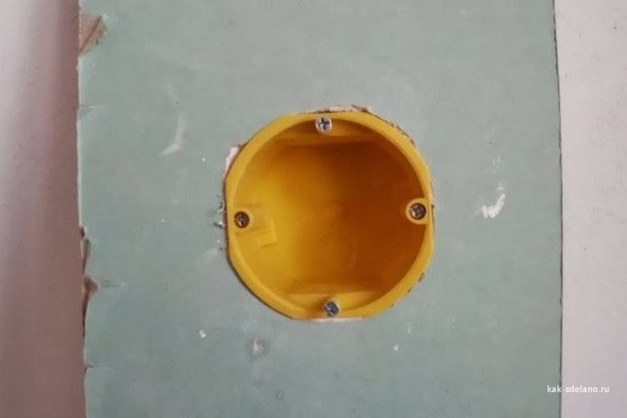Лучше всего выполнять работу при помощи коронки по дереву. После того как отверстие подготовлено, выведите в него провод и вставьте подрозетник таким образом, чтобы винты были расположены горизонтально. Зафиксируйте стакан в гипсокартоне, закрутив по часовой стрелке два утопленных винтика.