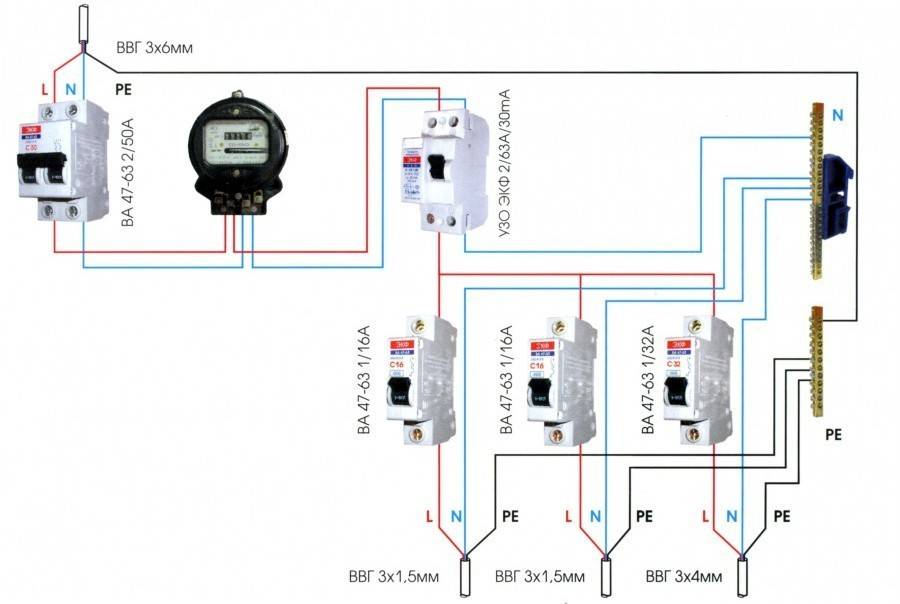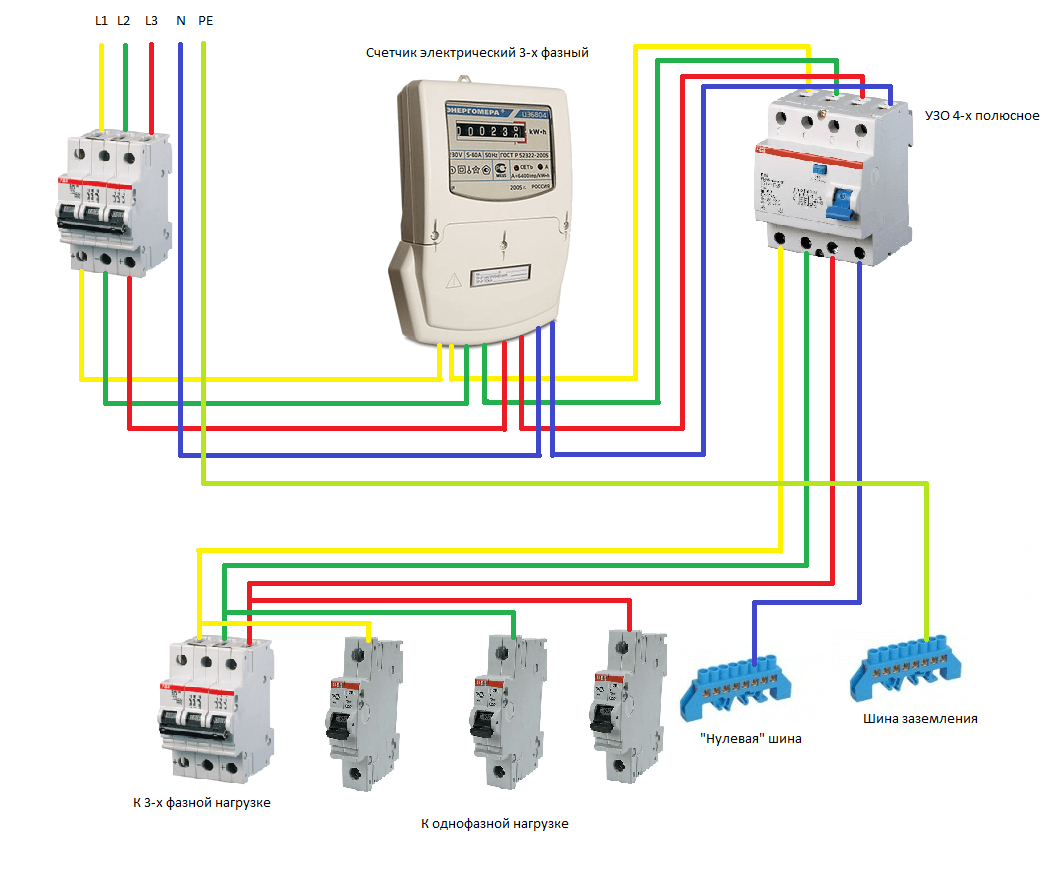 Имейте в виду, что широкое распространение получила ещё одна разновидность такой схемы, в ней между вводным автоматом и УЗО принято устанавливать счётчик электрической энергии.