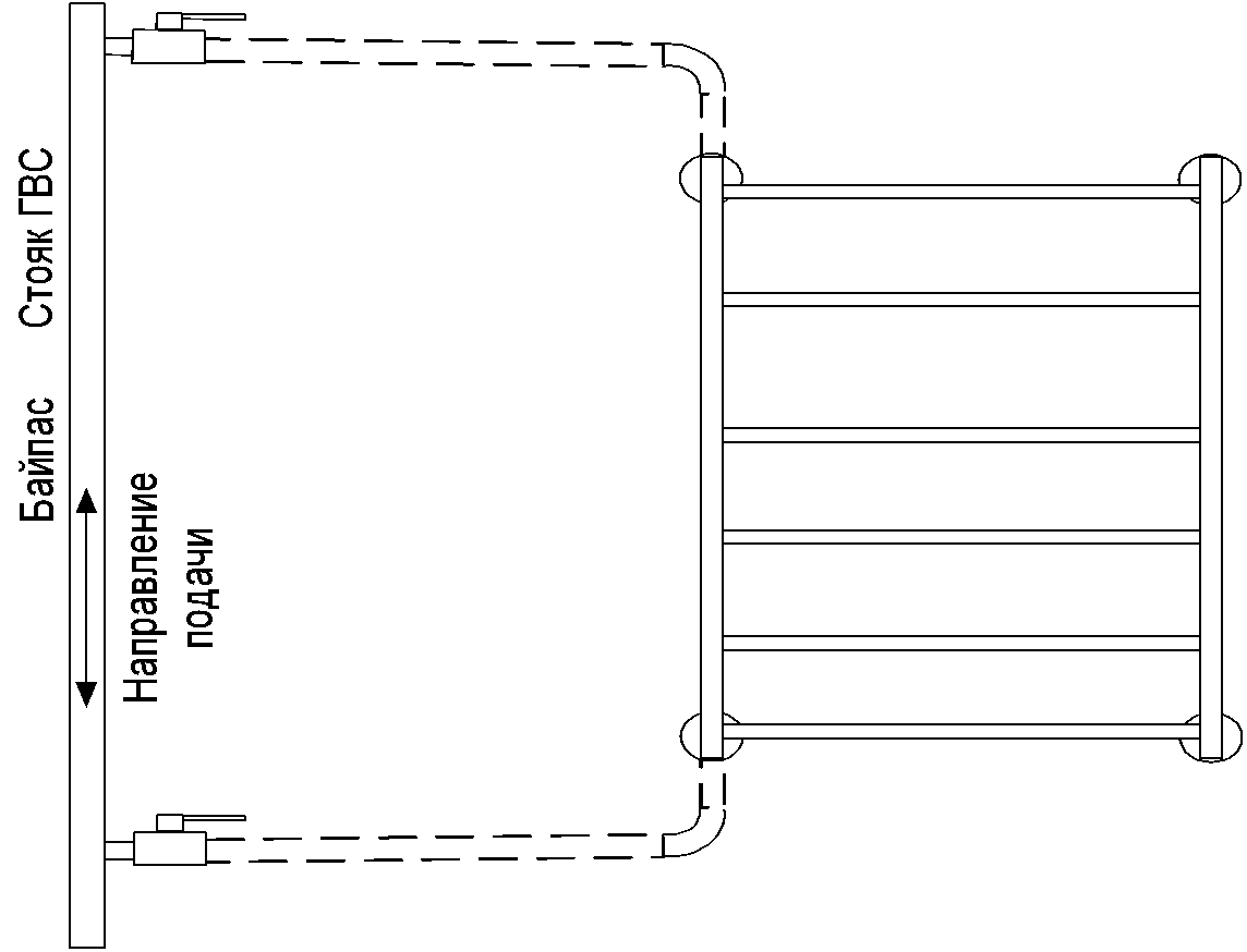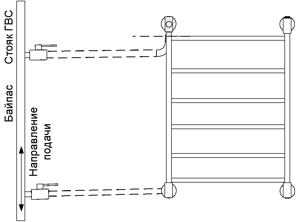 Если сантехнический прибор является частью стояка, то на нем нельзя устанавливать никаких запорных устройств. Чтобы появилась возможность отключать полотенцесушитель без перекрытия всего стояка, необходимо включить в систему байпас — перемычку, соединяющую отводы от стояка по направлению к прибору.
