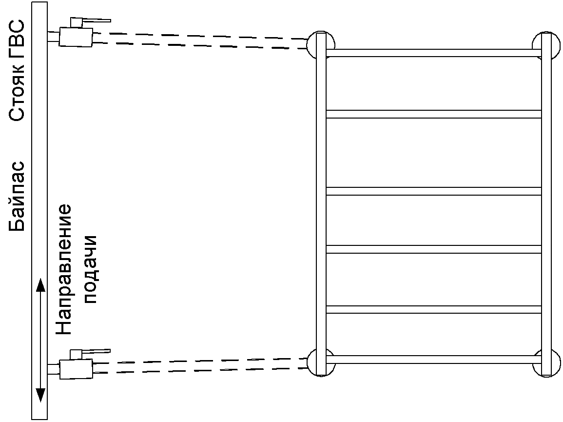 Данная схема обеспечивает подачу теплоносителя в верхнюю часть и выпуск остывшего теплоносителя обратно в стояк снизу. Циркуляция через полотенцесушитель обеспечивается только гравитационным напором остывающей в нём воды.