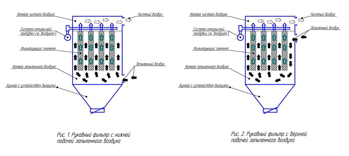 Фильтрующий элемент оборудования представляет собой рукав, изготовленный из иглопробивной нетканой материи. Существуют две основных конструкции: