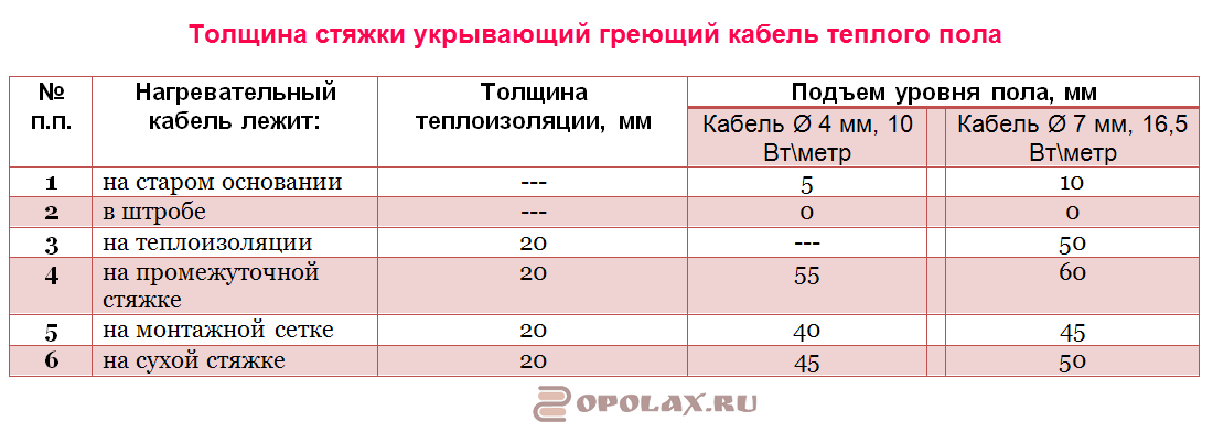 Для выбора толщины стяжки над греющим кабелем теплого пола, предлагаю еще одну таблицу.