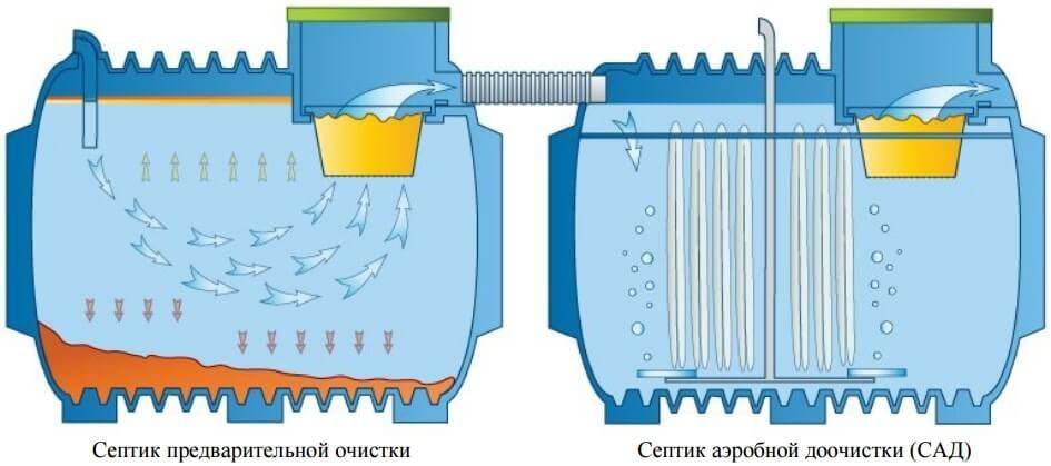 Очистные системы с несколькими уровнями бывают разных типов. Один из популярных вариантов представляет собой два этапа фильтрации – предварительной и с использованием аэробных бактерий.