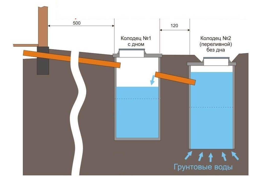Интересно, что при подъеме грунтовых вод уровень второго колодца значительно повышается, что приводит к забросу верхней части его содержимого обратно в первый колодец. С учетом этой особенности объем колодцев рассчитывается со значительным (не менее 30%) запасом по отношению к нормативному. Возможно также не двойная, а тройная фильтрация.