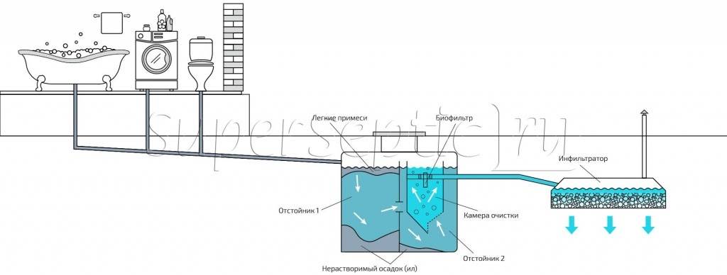 Если степень очистки недостаточная, то вода проходить процесс доочистки через инфильтрат, дренажный колодец, поля для грунтовой фильтрации и т.п.