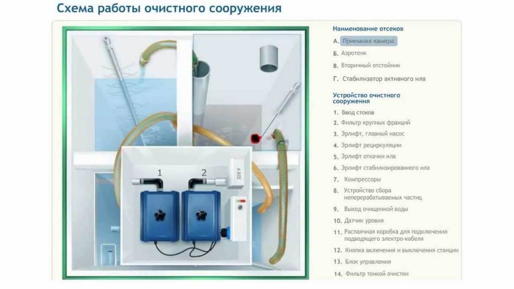 - Первая камера выполняет роль приемника. Разработаны модели для разной производительности по количеству стоков. На этой стадии вода смешивается с активным илом. Постепенно происходит накопление жидкости. Крупные включения опускаются на дно. Когда вода поднимется до определенной отметки, происходит автоматическое включение насоса для перевода жидкости в следующую камеру.