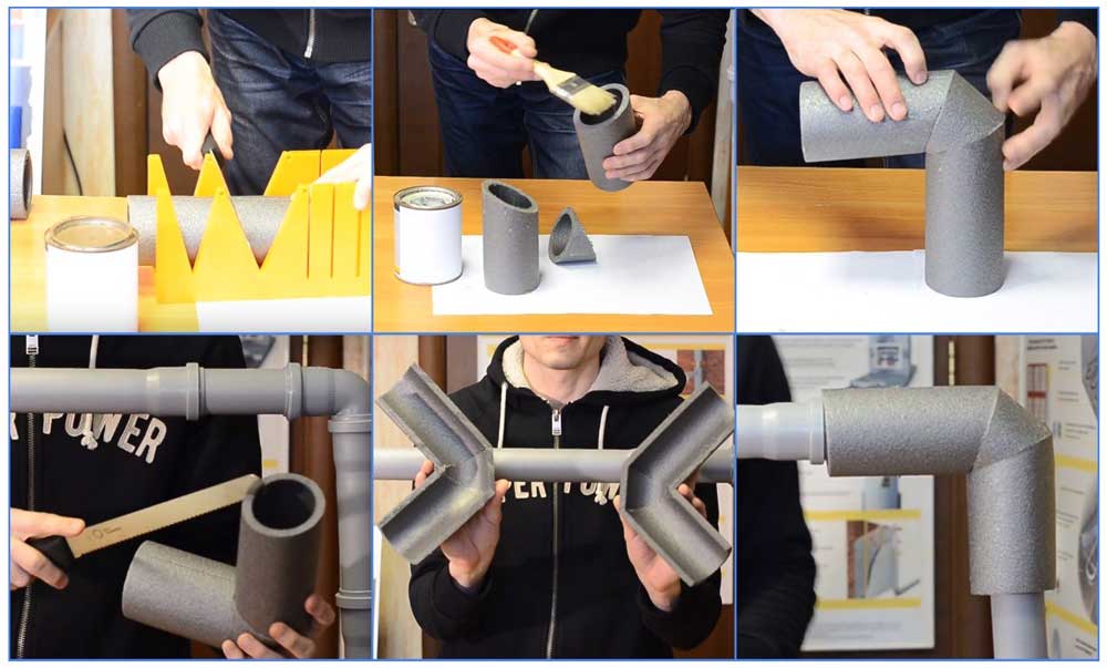 - Обрезают полученный угловой элемент вдоль специальным ножом, промазывают его продольные торцы клеем и одевают детали на угол трубопровода, половинки можно обмотать скотчем на 2 – 3 часа до высыхания клея, после чего фасонный узел готов к эксплуатации.