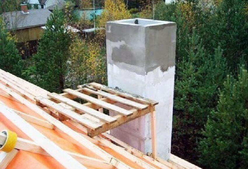 - Изготавливается деревянный каркас для дымохода, оббивается шифером и крепится вокруг трубы.