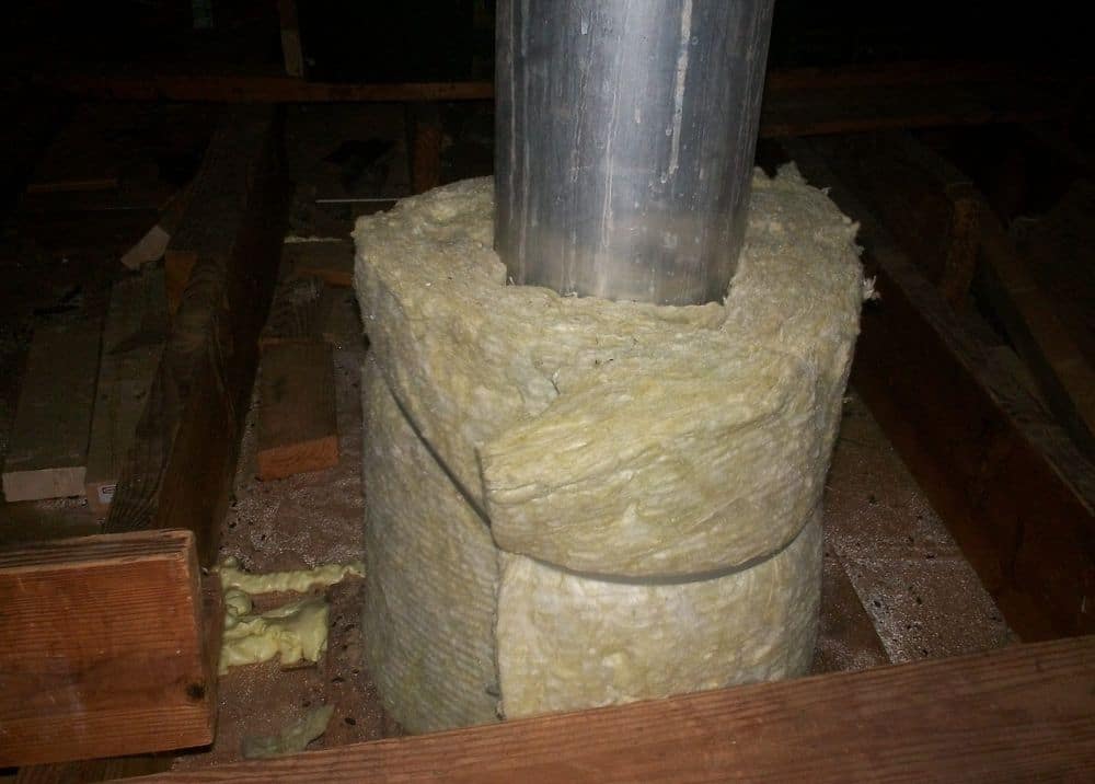 - Труба дымохода обшивается минеральной или каменной ватой.