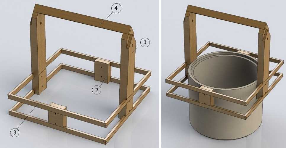 Можно в домик спрятать и бетонное кольцо. В этом случае ворот, как правило ставятся стойки отдельно, а затем собирается каркас. Размеры выбираете так, чтобы конструкция свободно накрывала кольцо. Высота — выше вашего роста сантиметров на 20: чтобы можно было спокойно наклоняться и доставать ведро.