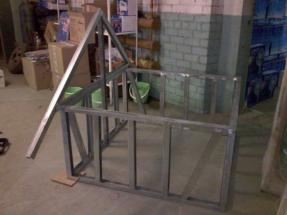 По этой же схеме можно сделать крышу для домика из металла. Если есть сварочный аппарат, использовать можно профильную трубу. К ней площе крепить отделочный материал.