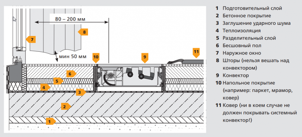 Место для установки внутрипольных конвекторов выбирается на расстоянии 8-20 см от окна, желательно по всей его длине