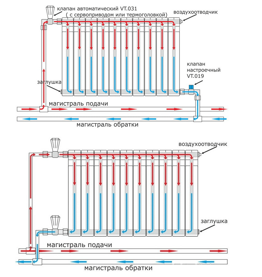 Чтобы уйти от неравномерного распределения носителя тепла, используют схемы с двумя трубами.