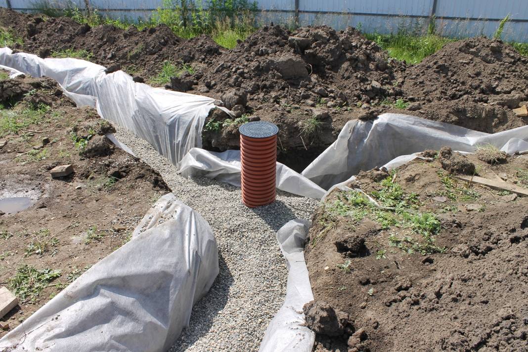После укладки трубопровода его засыпают щебнем. Трубы должны быть полностью закрыты. Свободные края геотекстиля заворачивают друг на друга по всей длине трассы. Закрытый дренаж засыпают сверху песком, а затем грунтом.