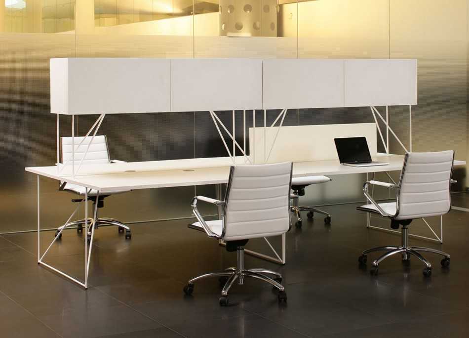 Конструкция позволяет разделить рабочие места визуально, обеспечив каждому сотруднику необходимое уединение, а также подавляет шумы в open space